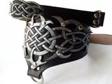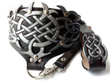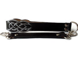 A black leather collar with a leash for a slave with a Celtic silver ornament is made of high quality vegetable tanned leather. Bdsm collar with ring has a top layer with an ornament and a leather base. Manual embossing is made on the upper layer of leather. The pattern is partially cut, painted with silver acrylic paint and attached with rivets to the bottom soft layer of leather. The collar is decorated with Italian nickel-plated fittings.